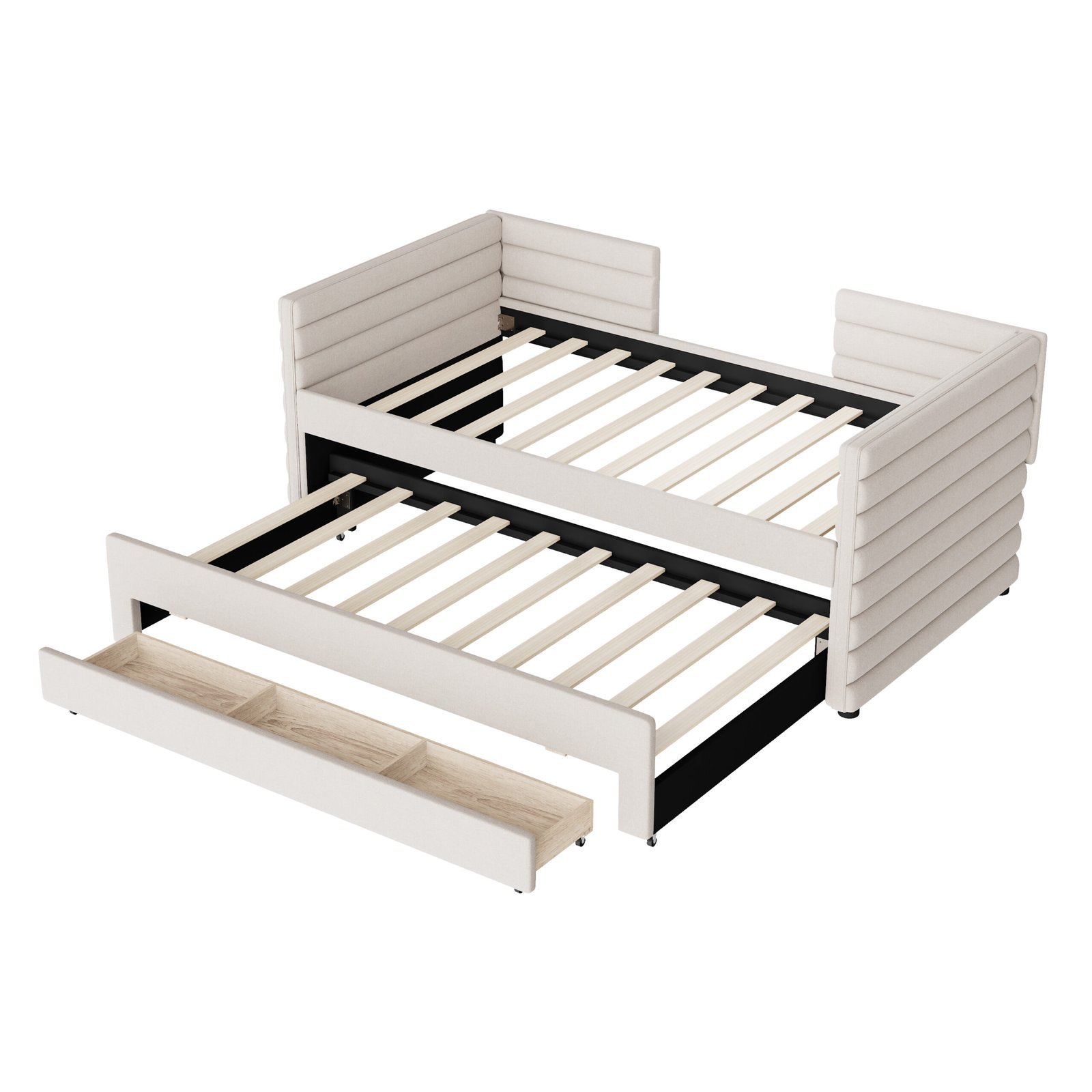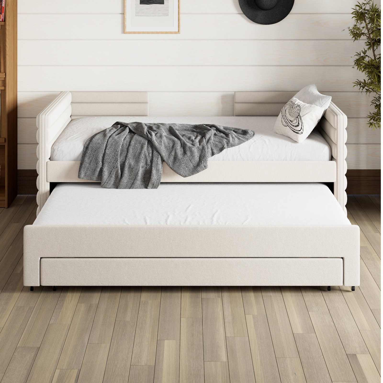 • 【Multifunctional Twin Daybed with Trundle】Perfect for small spaces, this twin size upholstered daybed features a pull-out trundle bed, ideal for sleepovers or hosting guests. Whether in the living room, guest room, or home office, it offers both a comfortable bed and a stylish seating solution.